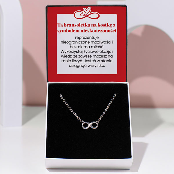Symbol nieskończoności reprezentuje wieczność i bezgraniczny świat. Symbolizuje on także bezwarunkową miłość, nadzieję i wiarę w świetlaną przyszłość. Silna symbolika sprawia, że bransoletka jest ważnym elementem biżuterii i świetnym pomysłem na prezent.