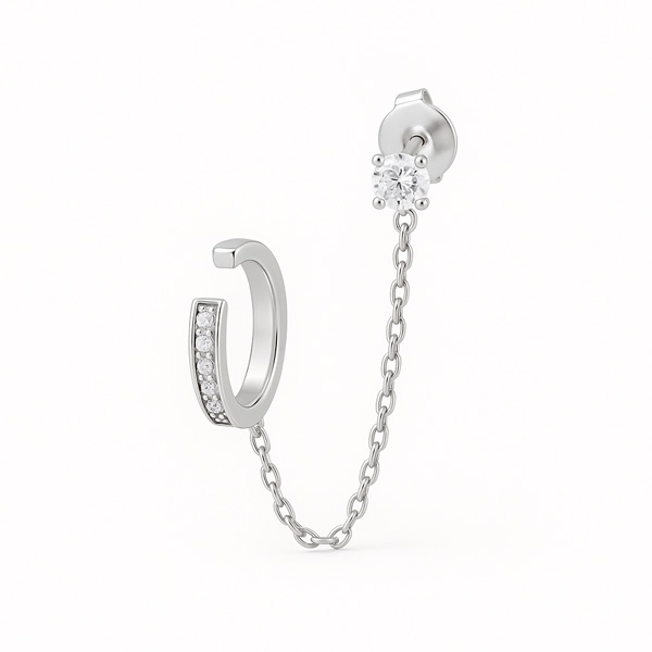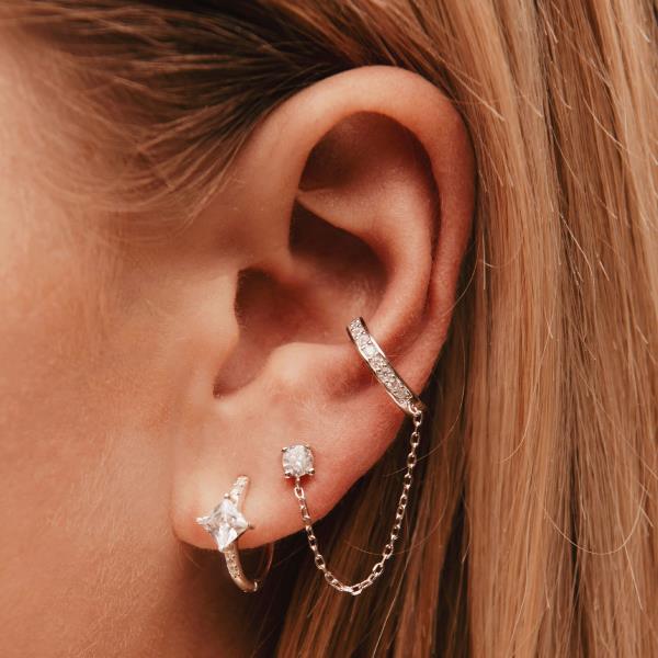Dwuczęściowy kolczyk Clarie można dowolnie układać i tworzyć ciekawe dzieła sztuki na uchu. Dobrze komponuje się również w połączeniu z jednym lub kilkoma innymi kolczykami. Kolczyk jest dostępny jako pojedynczy element i nadaje się do łączenia ze wszystkimi innymi kolczykami.