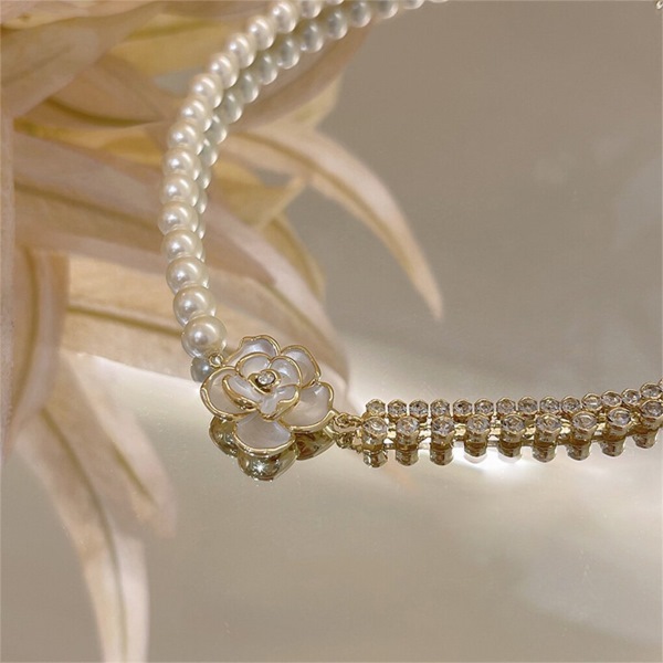 Materiały: Perły premium w kolorze białym, wysokiej jakości cyrkonie, złocona kamelia jako ozdoba centralna